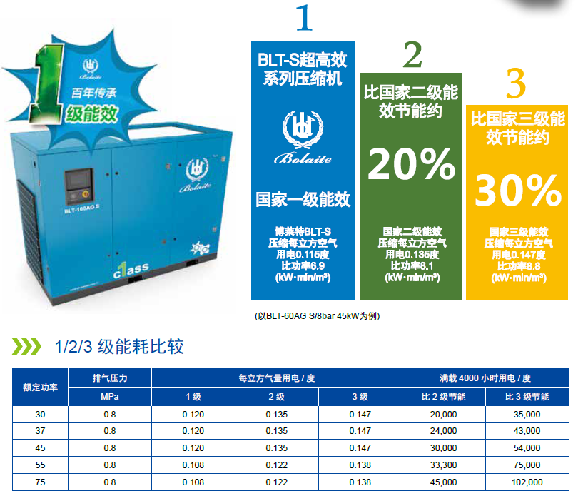 博萊特BLT S 超高效系列壓縮機(jī)全部達(dá)到國(guó)際一級(jí)能效,比二級(jí)能效節(jié)能約20%,比三級(jí)能效節(jié)能約30%。